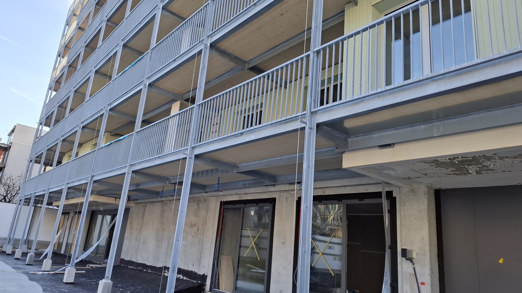 Die Rytz AG hat die Stahlbalkone inkl. der Geländer sowie die Balkon-Stützen und -Träger vom EG bis zur Attika fertigestellt. Die Konstruktion besteht aus feuerverzinkten Stahlelementen.