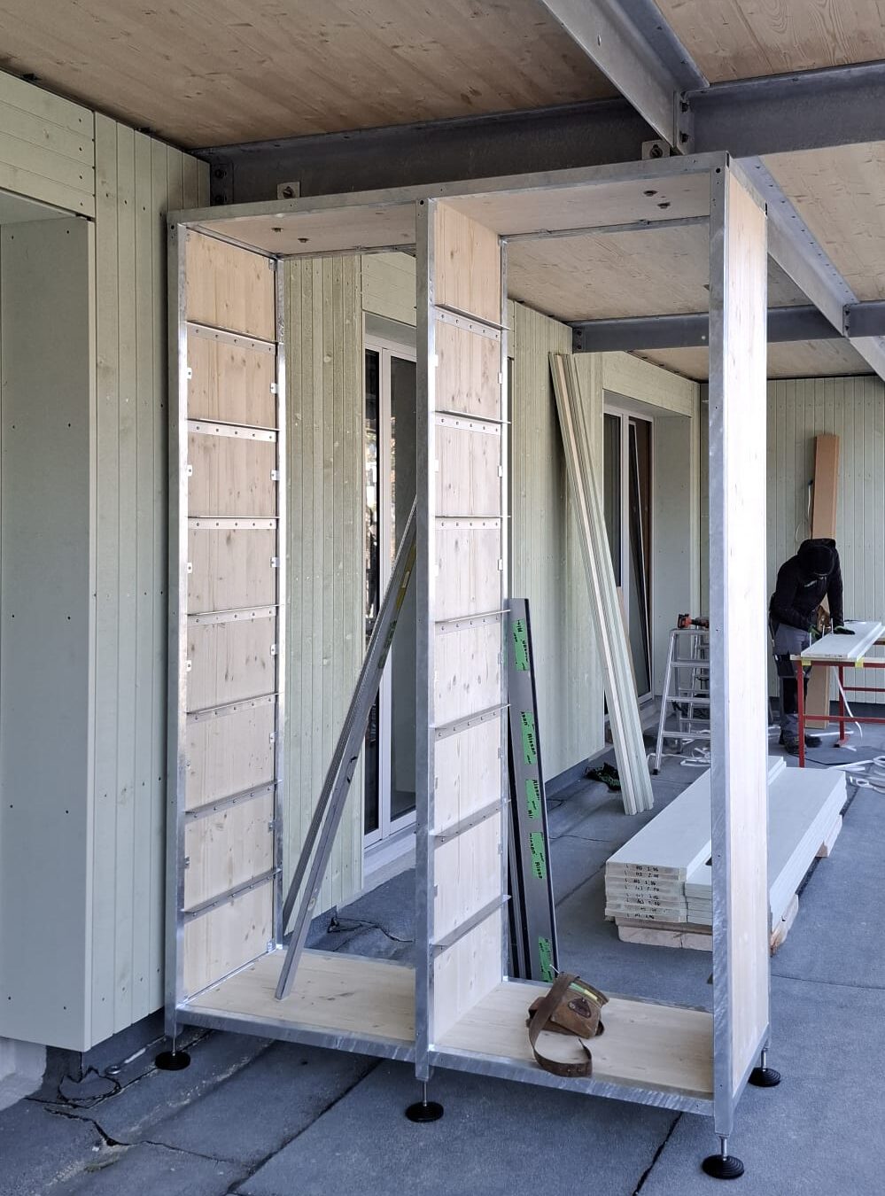 Derzeit entstehen als Schränke auf den Balkonen, welche als Trennung genutzt werden. Als letzter Schritt erfolgt die Montage des Sichtschutzes.