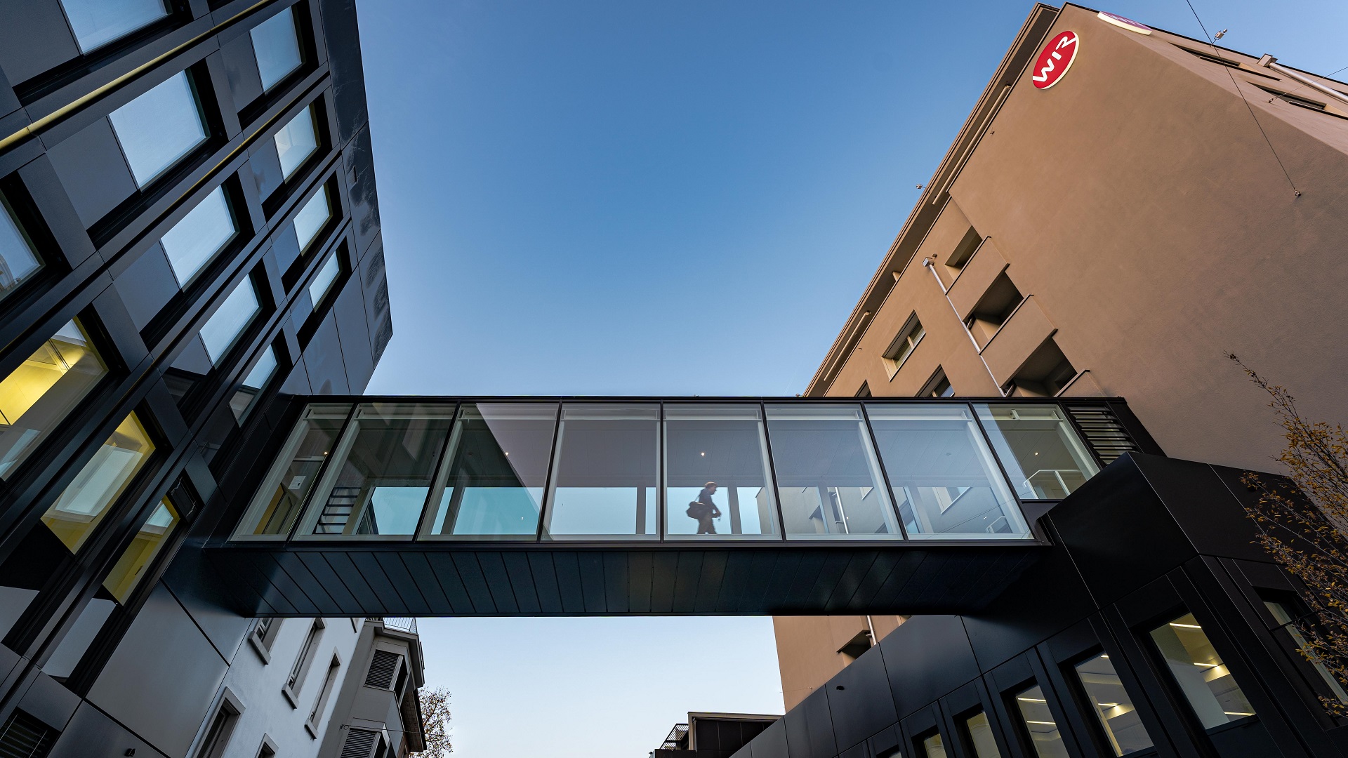 As a physical connection of the two company buildings “Auberg 1 & 3”, an unheated gangway was realized. This was pre-assembled at the factory and transported directly to the construction site by truck.